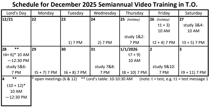 B. Two open meetings (Video only), Lord’s Day mornings, December 28 & January 4.